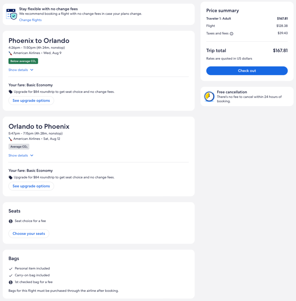 Discounted flights from Phoenix to Orlando from $168 round-trip.