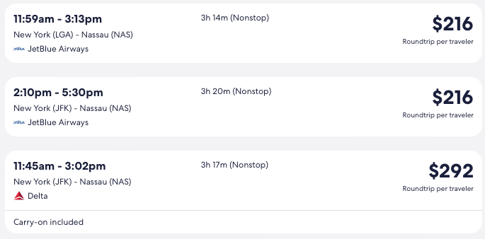 Discounted flights from New York to Nassau, Bahamas from $216 round-trip.