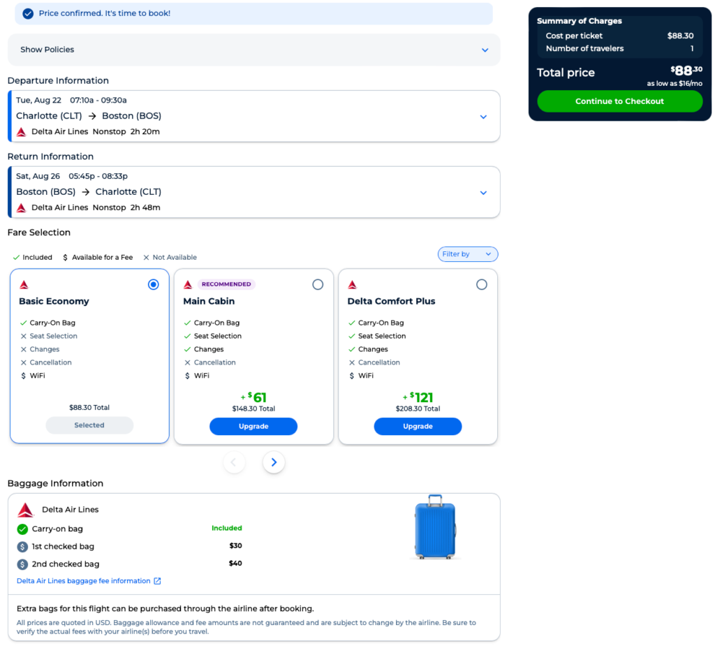 Discounted flights from Charlotte to Boston from $88 round-trip.