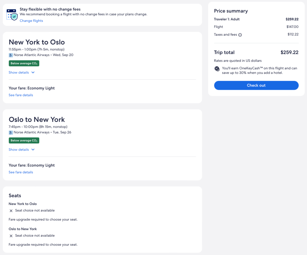 Note, that Norse is a budget carrier with optional fees: seat selection, baggage etc.