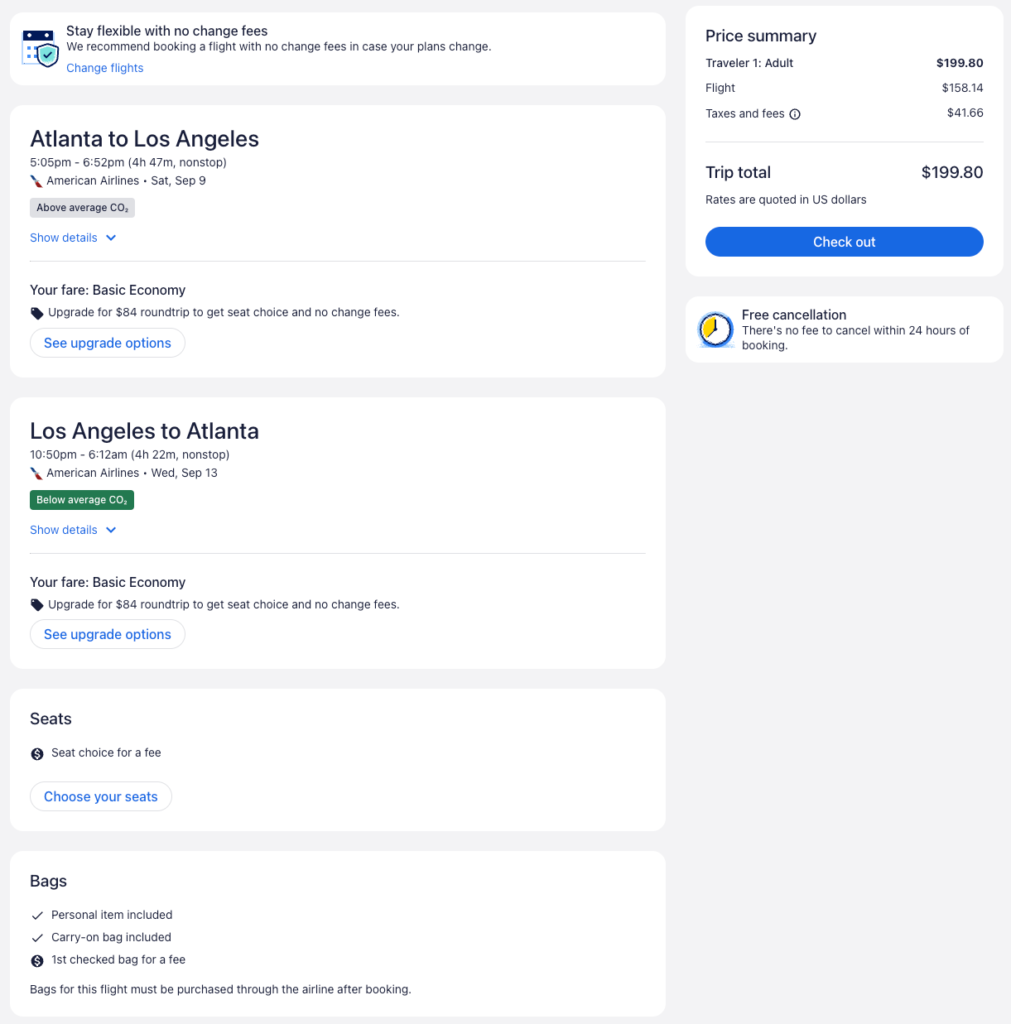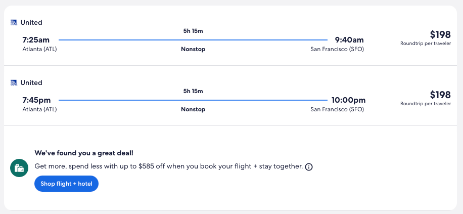 Discounted flights from Atlanta to Los Angeles or San Francisco from $198 round-trip.