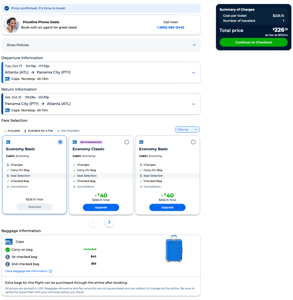AVAILABILITY: limited to Departures on Oct 14, 15, 17; and returns on Oct 21, 22.