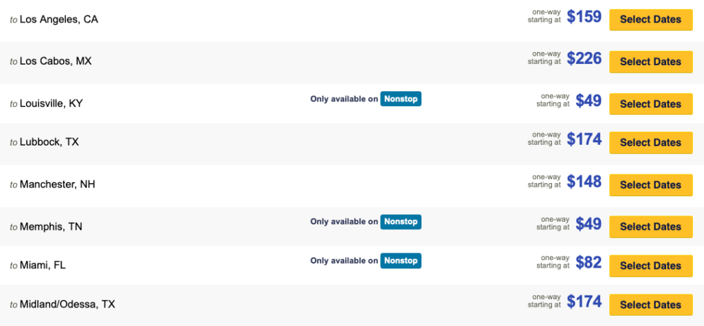 Nonrefundable. Seats, travel days, and markets limited. Fares valid on nonstop service where indicated; if not indicated, fares are valid on single connecting service.